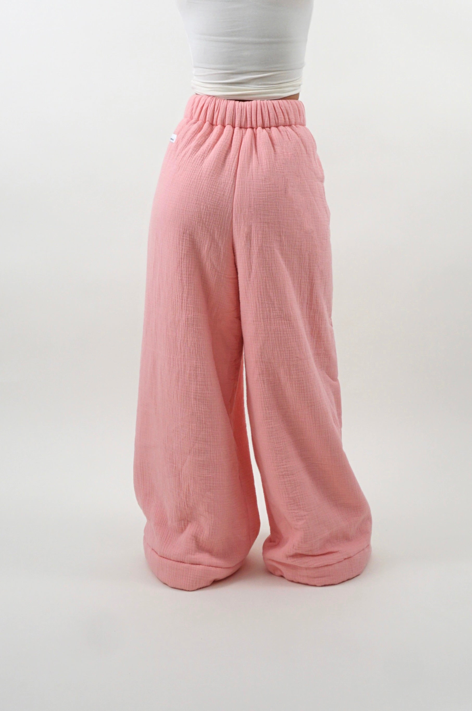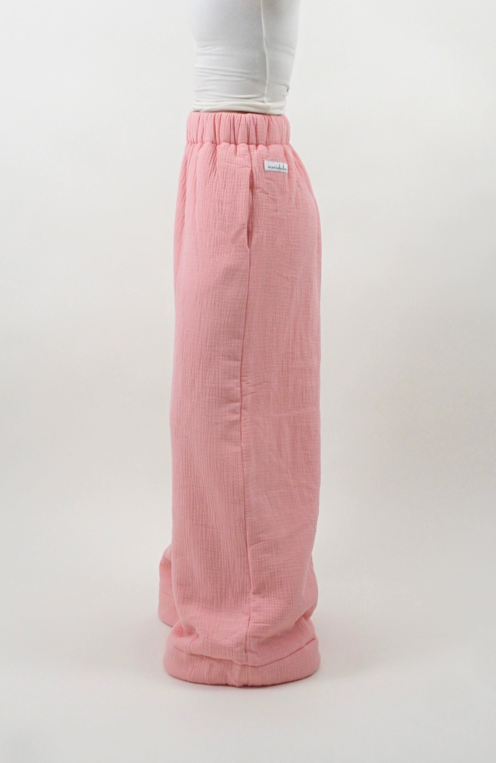 The homebody pants were designed to replicate the feel of wearing a blanket. With a sherpa interior followed by a soft bubble gauze exterior, they are perfect for a night in, catching a movie, getting food, running errands, the list goes on.